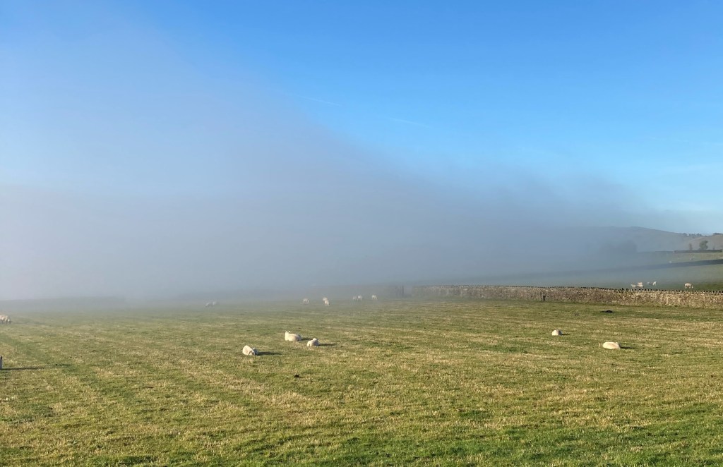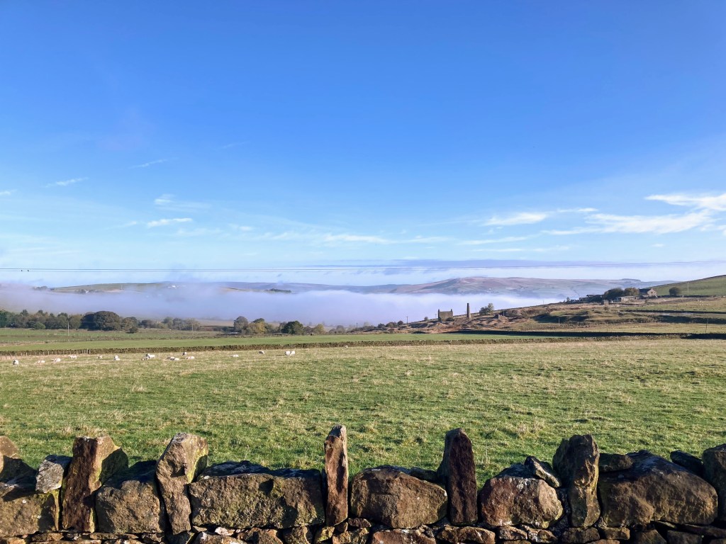 Lightness and happiness returns as birds sing and sheep lazily graze in the fields. The distant hills take on an autumnal purple hue in the beautiful bright sunshine. Looking back, the valley is hidden by pristine white fluffy clouds, a protective layer of cotton wool that is keeping the inhabitants safe and warm like a blanket.